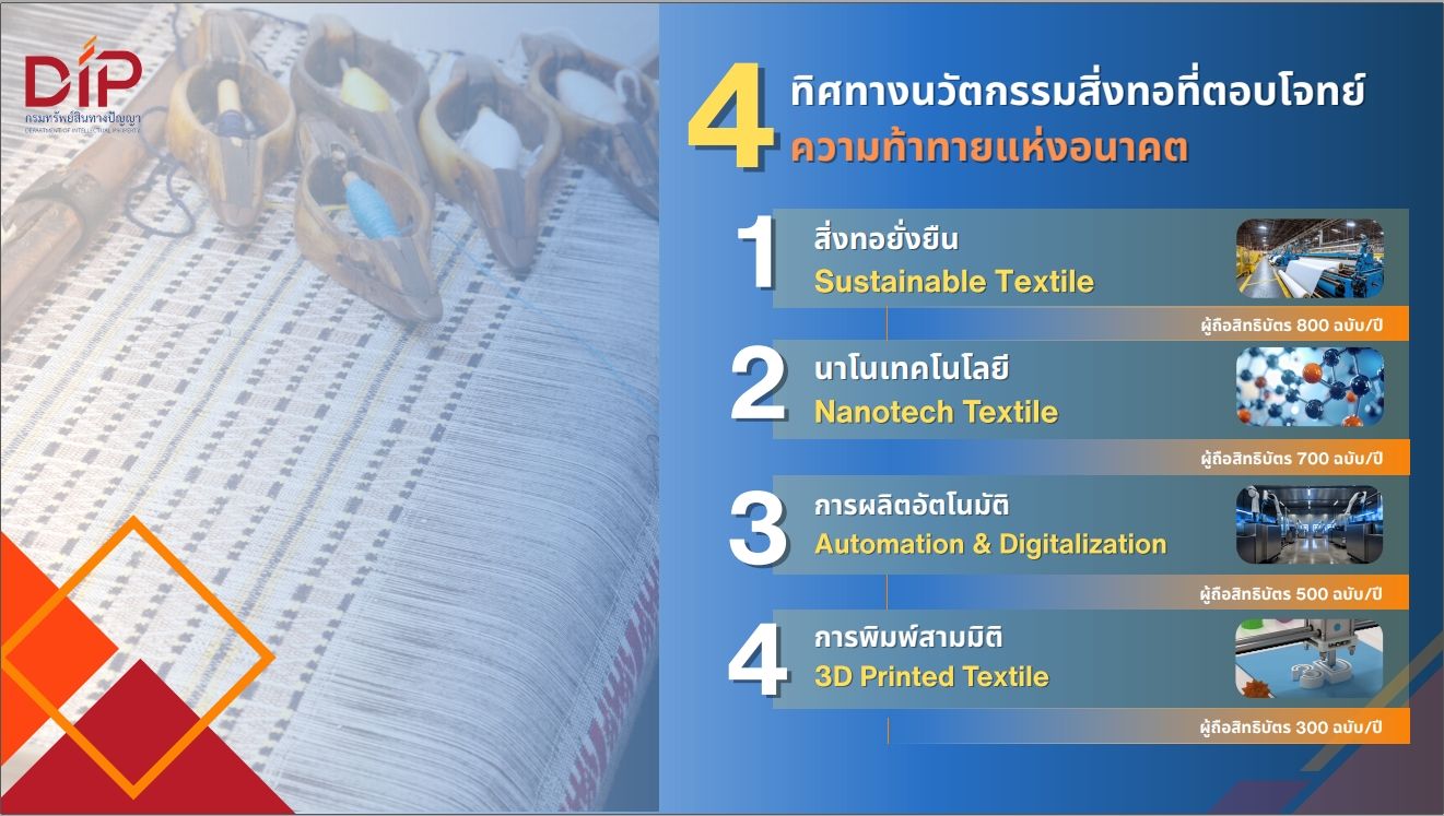 เจาะบทวิเคราะห์เทรนด์ “สิทธิบัตรสิ่งทอ” ในรอบ 2 ทศวรรษ หนุนไทยพลิกบทบาทจากผู้ผลิตสู่เจ้าของนวัตกรรม เพื่อขยับขึ้นแท่นผู้นำนวัตกรรมสิ่งทอของอาเซียน