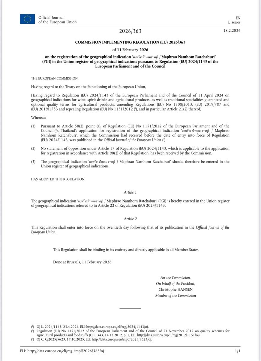 กรมทรัพย์สินทางปัญญาเผยข่าวดี “มะพร้าวน้ำหอมราชบุรี” ได้รับการขึ้นทะเบียนสิ่งบ่งชี้ทางภูมิศาสตร์ (GI) ในสหภาพยุโรปแล้ว นับเป็นอีกก้าวสำคัญของสินค้าเกษตรไทยในเวทีสากล ช่วยสร้างชื่อเสียงและยกระดับมาตรฐานคุณภาพผลไม้ไทยให้เป็นที่ยอมรับในระดับนานาชาติ พร้อมเปิดประตูสู่โอกาสทางการค้าใน 27 ประเทศสมาชิกสหภาพยุโรป และเพิ่มศักยภาพการแข่งขันในตลาดพรีเมียมอย่างเป็นรูปธรรม