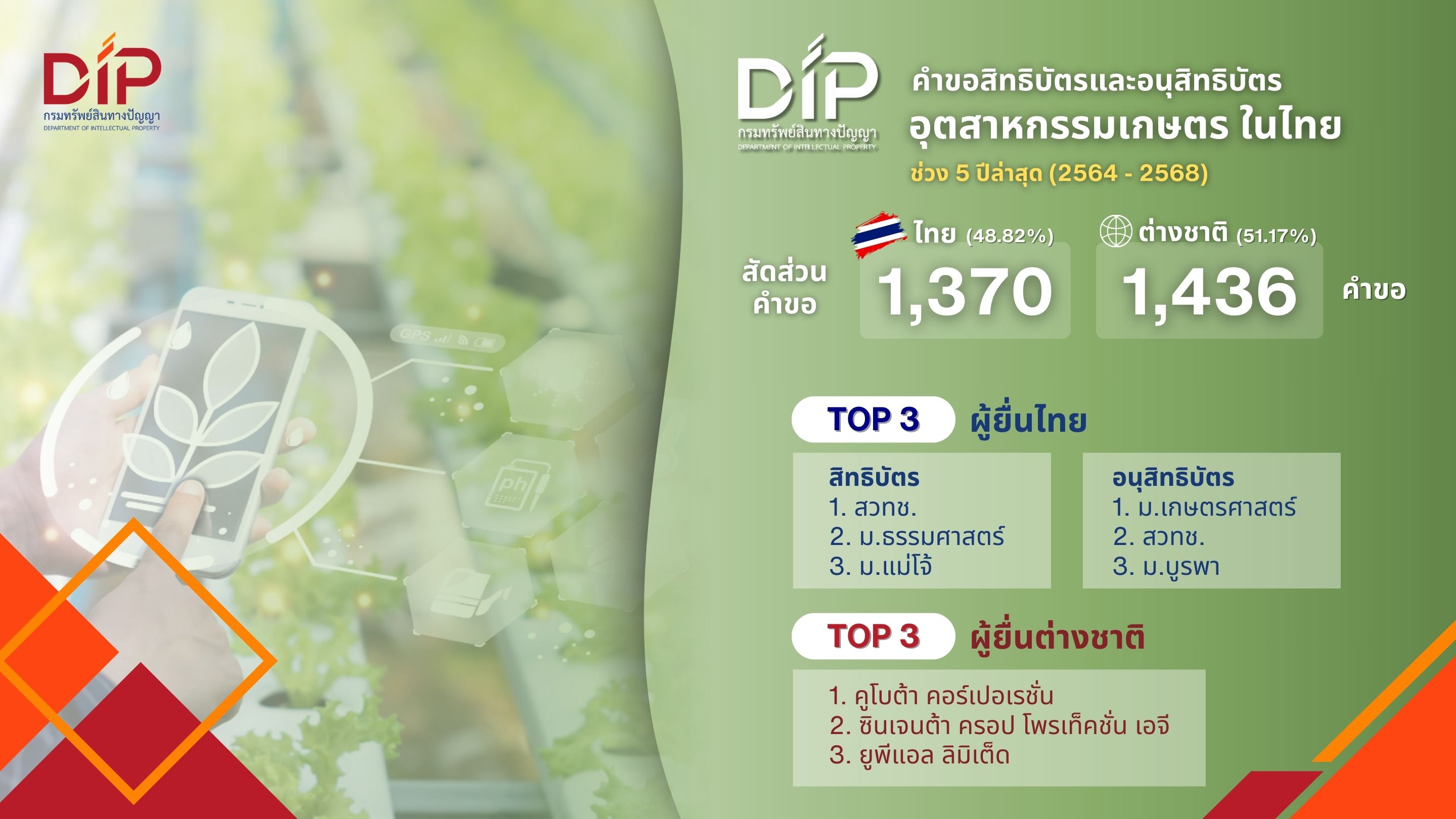 กรมทรัพย์สินทางปัญญา เผยบทวิเคราะห์แนวโน้มสิทธิบัตรด้านเกษตรกรรมทั่วโลก พบว่าภาคเกษตร