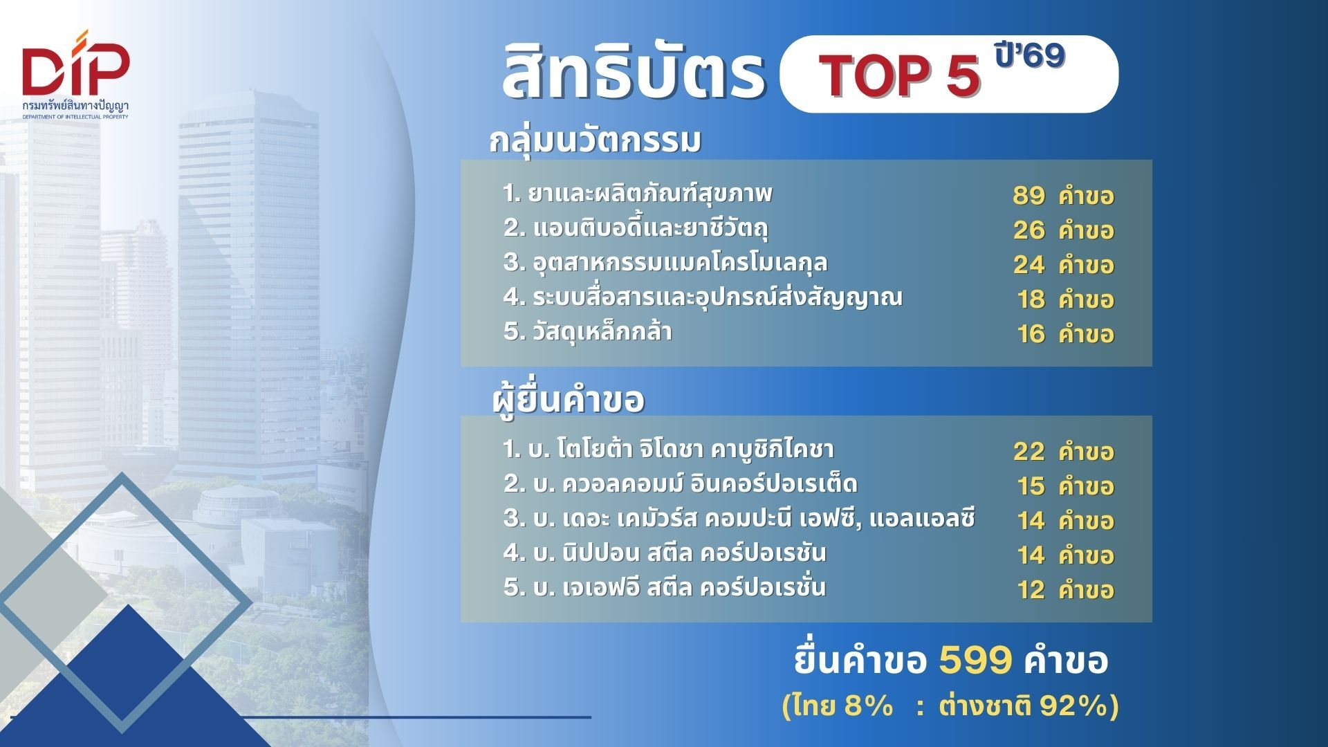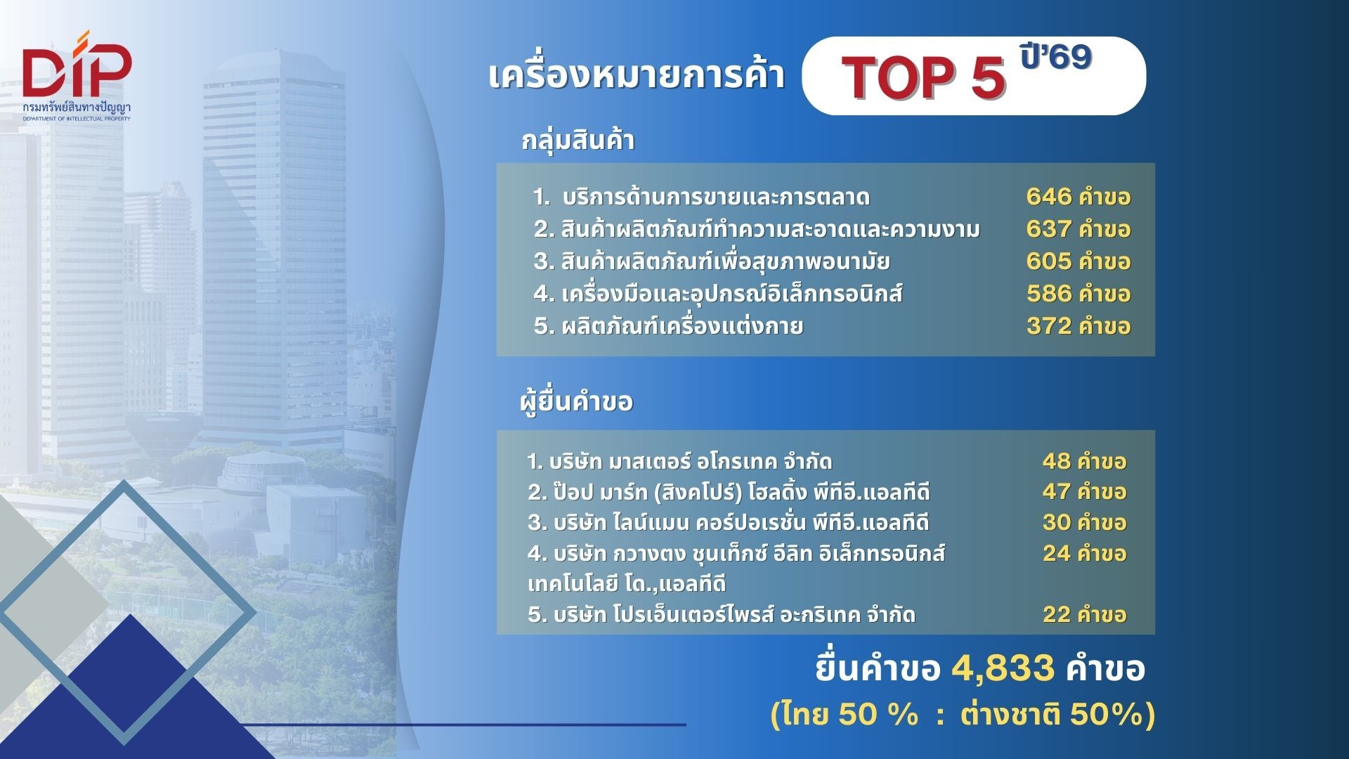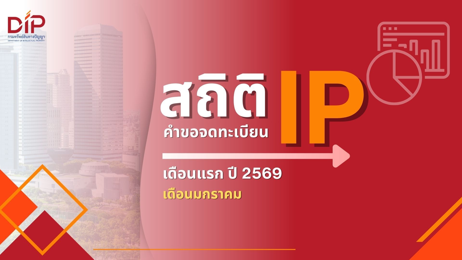 กรมทรัพย์สินทางปัญญา เผยสถิติขอจดทะเบียน/แจ้งข้อมูลทรัพย์สินทางปัญญา ในไทย เดือนแรกปี 2569 ยอดรวมกว่า 7,384 คำขอ เทรนด์สุขภาพมาแรง ติดอันดับ Top5 คำขอ IP หลายประเภท