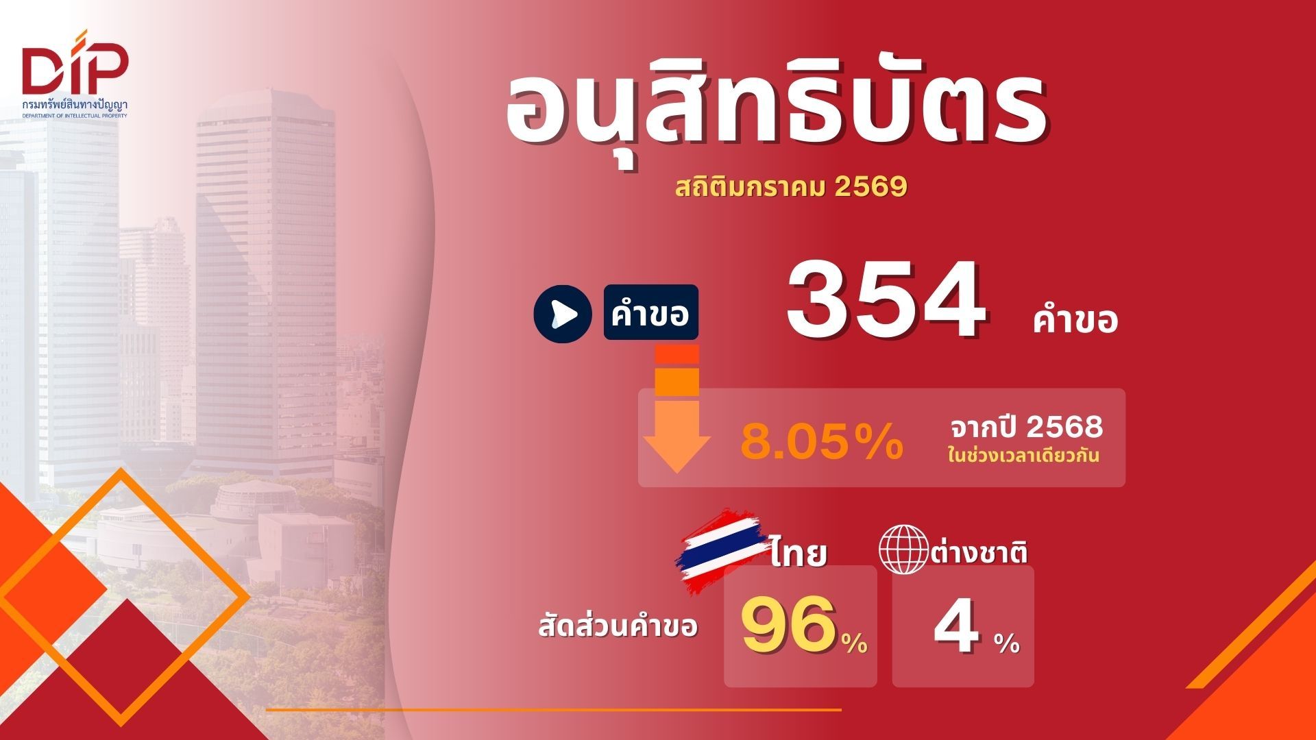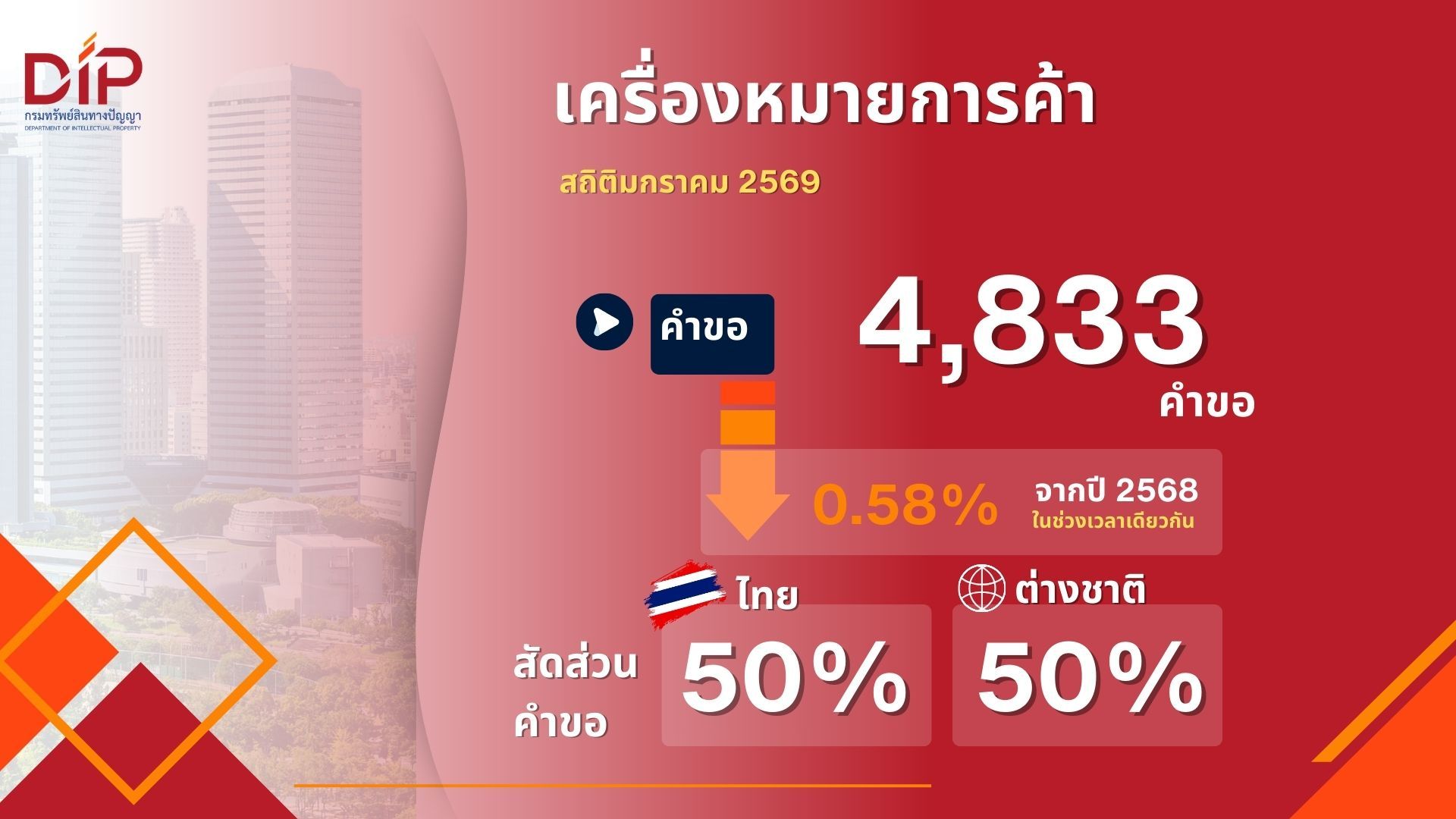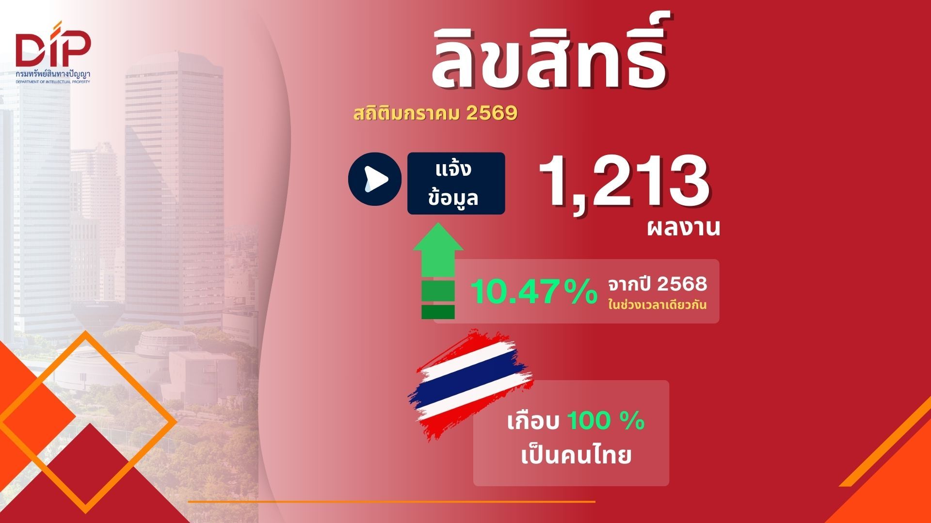ในเดือนมกราคม 2569 มีการยื่นคำขอจดทะเบียนกว่า 6,171 คำขอ ลดลงประมาณ 2.47% เมื่อเทียบกับช่วงเวลาเดียวกันในปี 2568 (6,327 คำขอ) และมีการแจ้งข้อมูลลิขสิทธิ์ 1,213 รายการ เพิ่มขึ้น 10.47% จากปี 2568