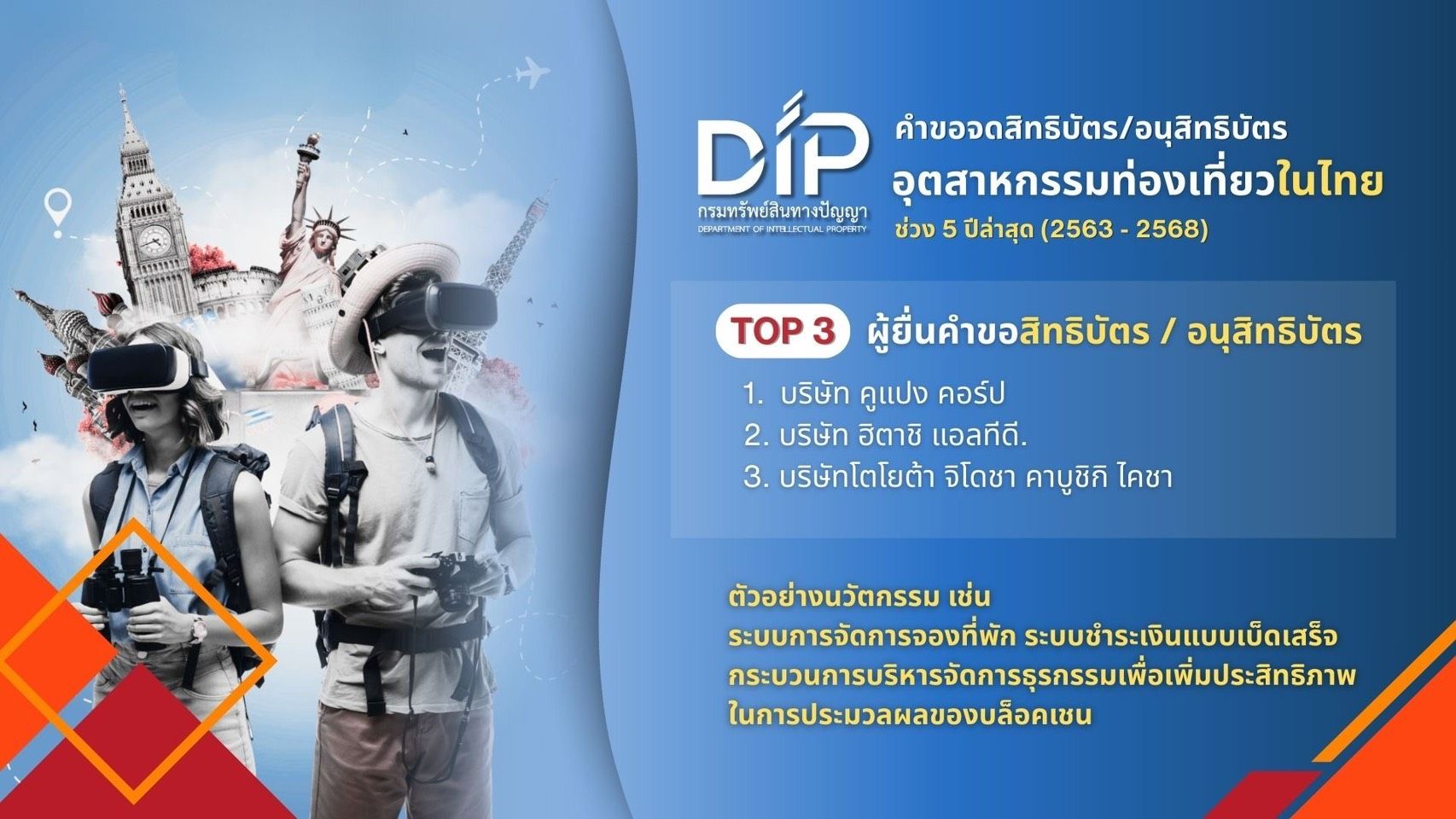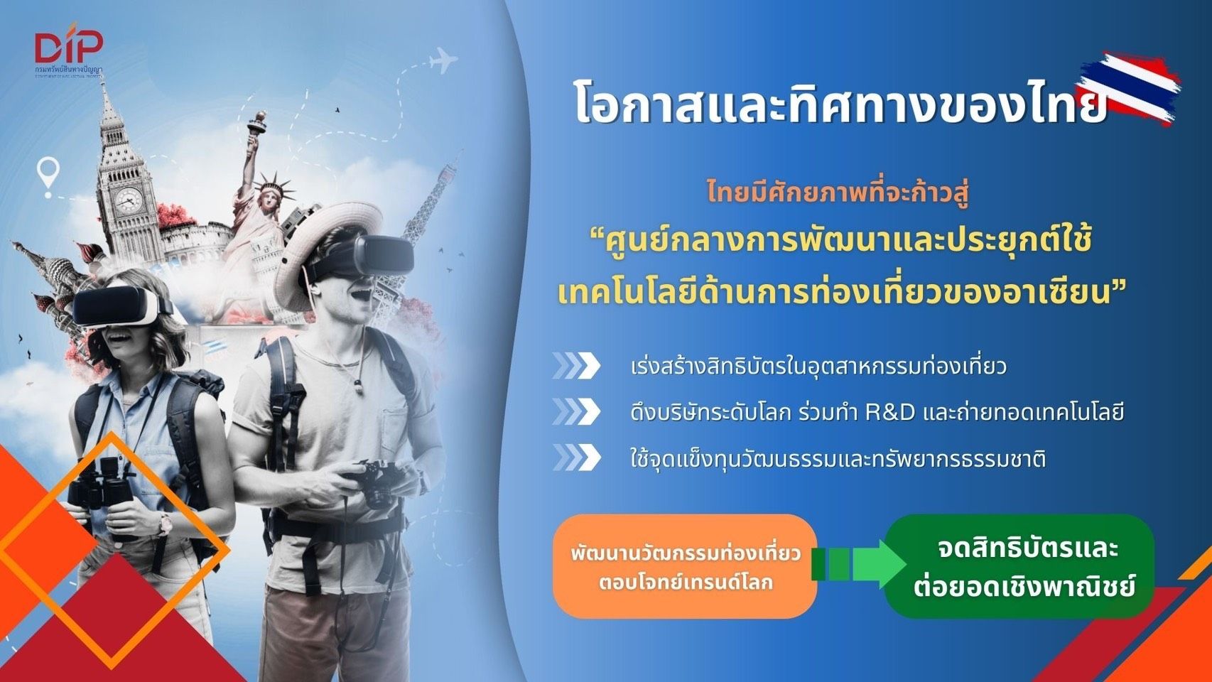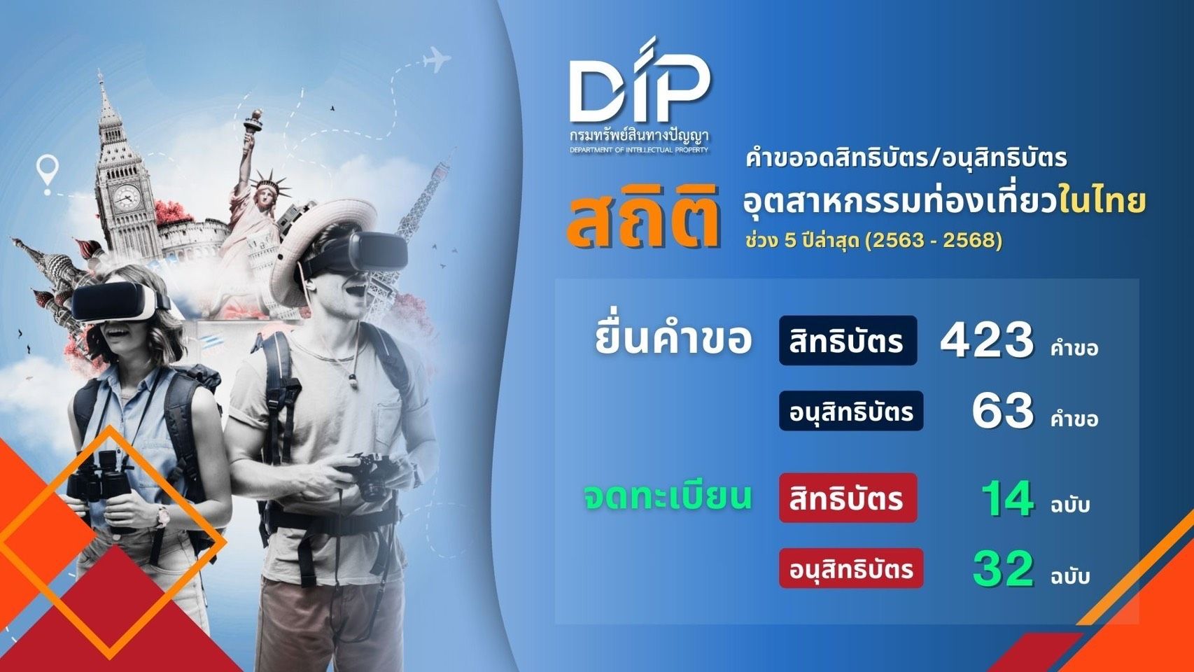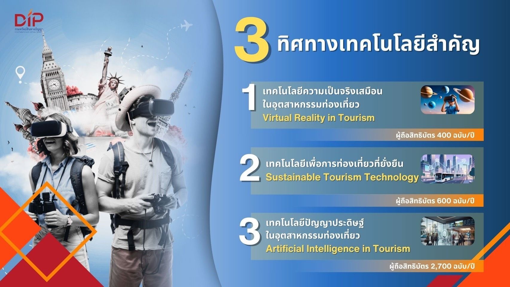 กรมทรัพย์สินทางปัญญา เผยบทวิเคราะห์แนวโน้มเทคโนโลยีด้านการท่องเที่ยวจากฐานข้อมูลสิทธิบัตรทั่วโลก ระหว่างปี 2549 – 2568 พบอุตสาหกรรมท่องเที่ยวกำลังเผชิญการเปลี่ยนผ่านครั้งใหญ่ โดยมีแนวโน้มปรับตัวสู่ยุคการใช้เทคโนโลยีเต็มรูปแบบ สะท้อนโอกาสอย่างมหาศาลในการพัฒนานวัตกรรมเพื่อยกระดับการท่องเที่ยวภายในประเทศ ชี้นวัตกรรมท่องเที่ยวของไทยเติบโตสูงถึง 145% ต่อปี เป็นสัญญาณชัดเจนถึงศักยภาพที่จะก้าวสู่การเป็นผู้เล่นแถวหน้าในการพัฒนาและประยุกต์ใช้เทคโนโลยีด้านการท่องเที่ยวของไทย