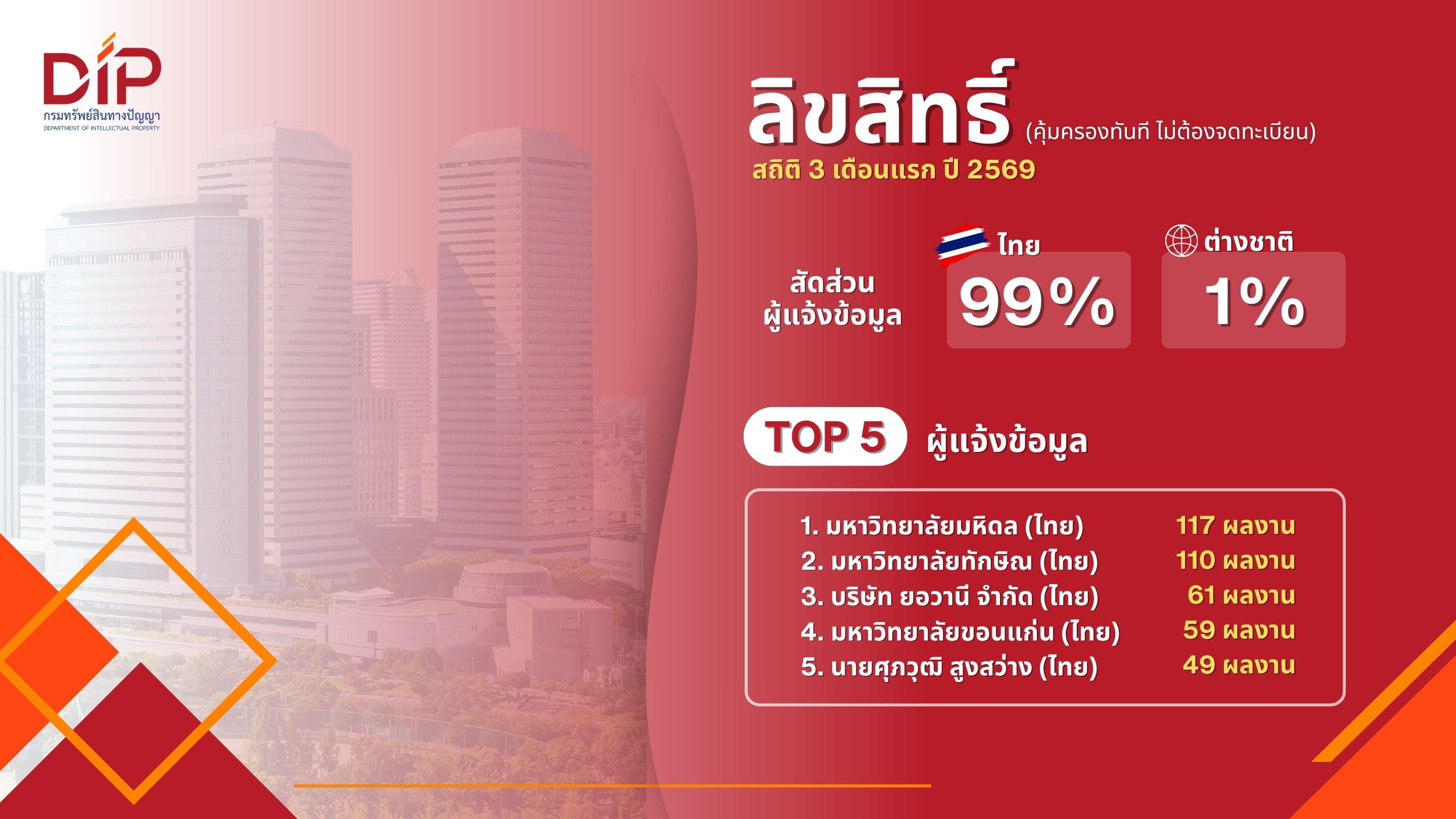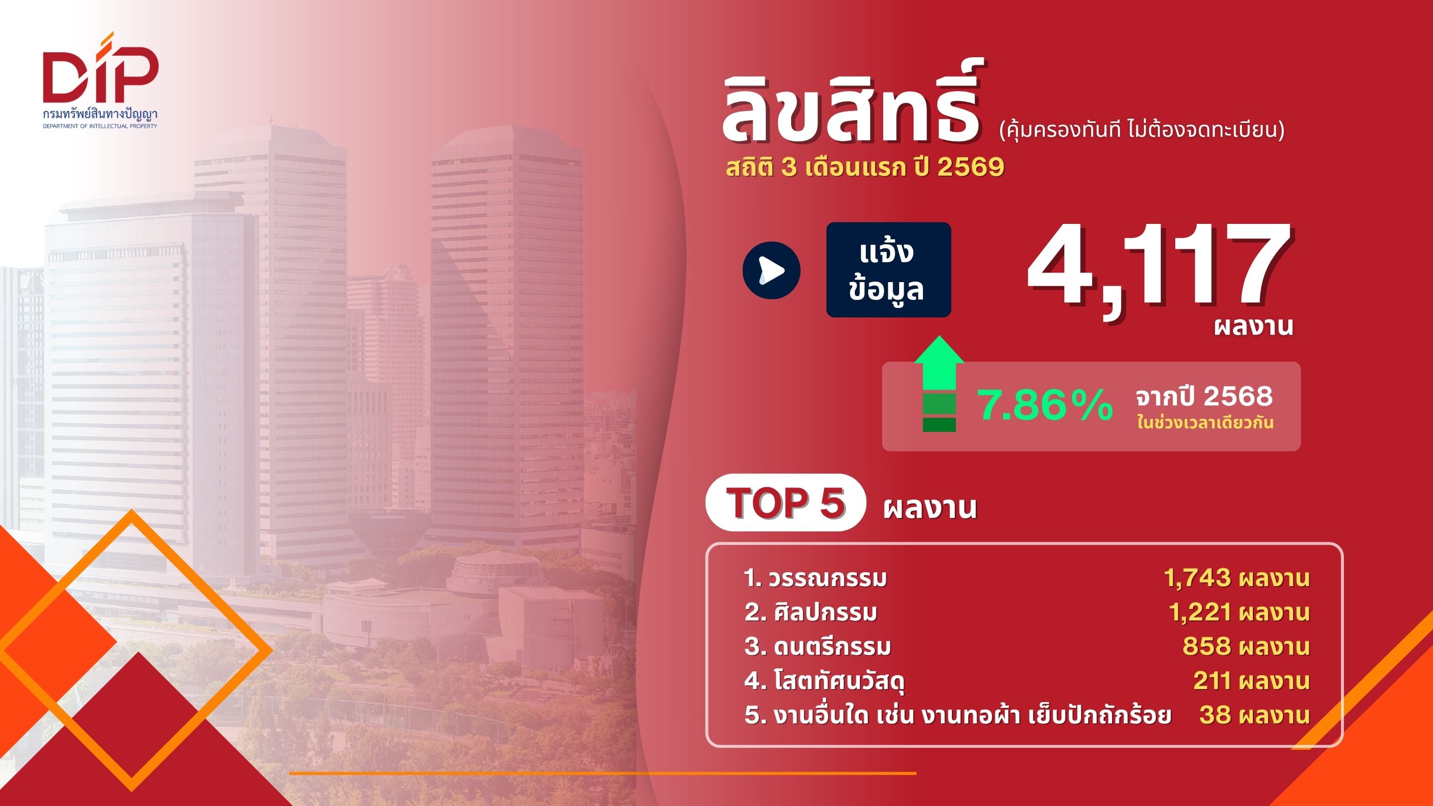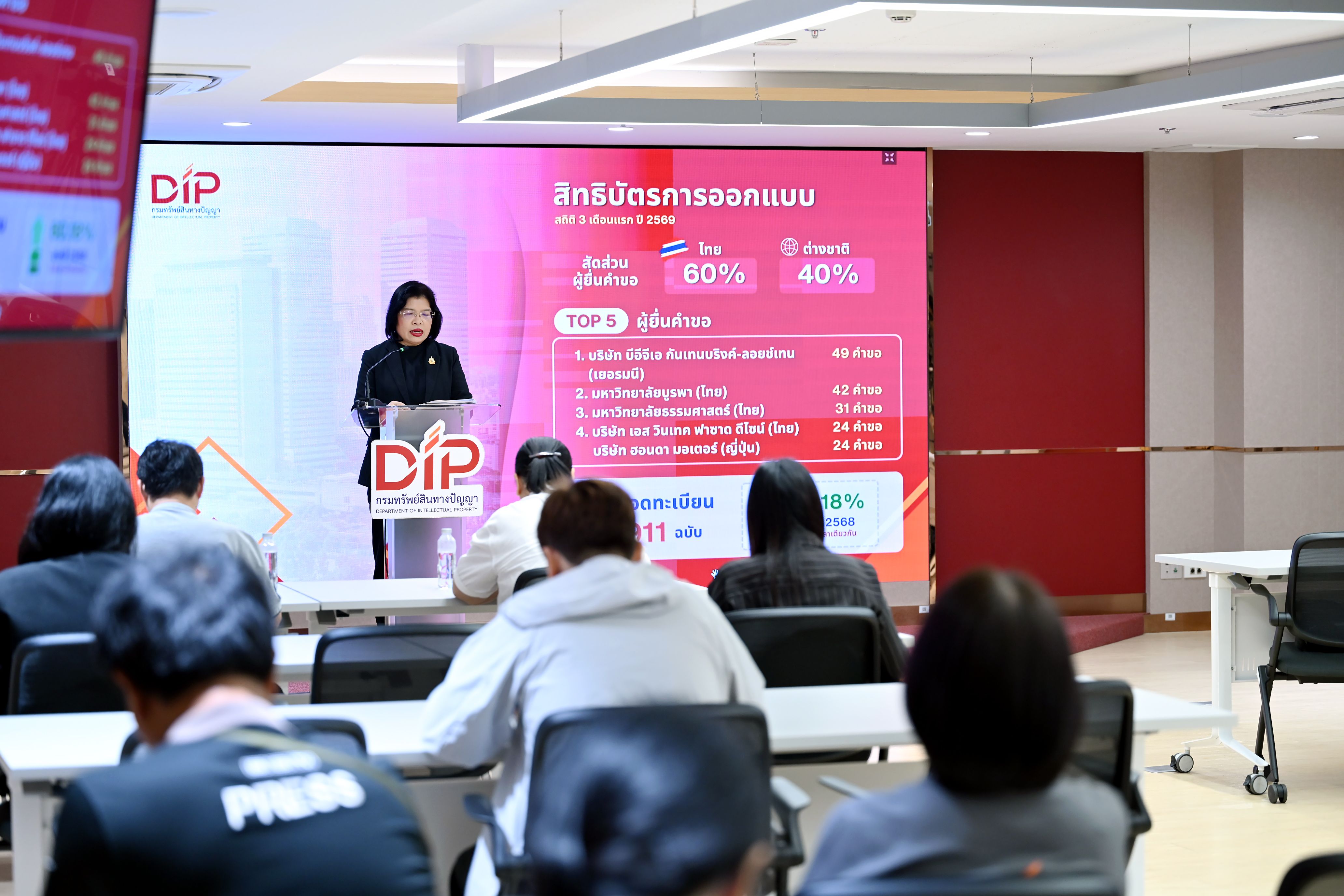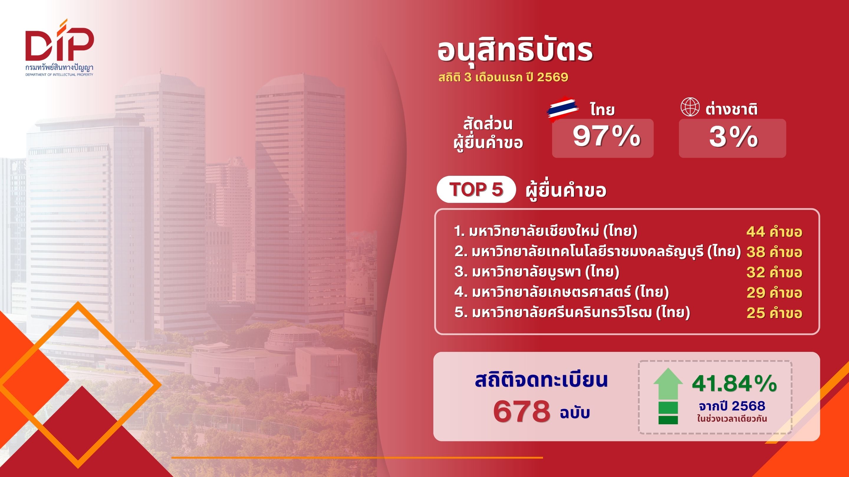 กรมทรัพย์สินทางปัญญา เร่งเพิ่มประสิทธิภาพคุ้มครอง IP ในไทย ดันยอดรับจดทะเบียนโตกว่า 10.23% ใน 3 เดือนแรกปี 69 ขณะที่ภาพรวมคำขอใหม่ขยายตัวต่อเนื่อง สะท้อนความเชื่อมั่นผู้ประกอบการไทย-ต่างชาติ เดินหน้าสร้างระบบนิเวศ IP ที่เอื้อการค้าการลงทุน
